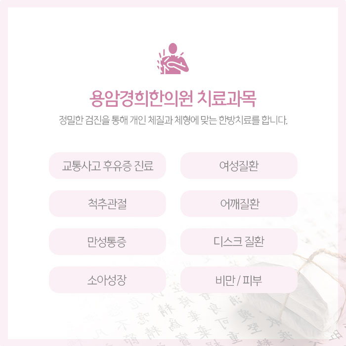 용암경희한의원에서는 통합적인 한방치료로 산후풍, 산후비만 및 우울증 예방과 회복을 도와드립니다. 과잉진료 없이 환자분에게 꼭 필요한 치료만 하며 검증된 재료와 방법으로 정직한 한방치료를 약속드립니다. 매일 밤 9시까지 야간진료를 하며 공휴일과 주말에도 6시까지 운영하고 있으므로 참고하셔서 이용에 불편없으시길 바랍니다.