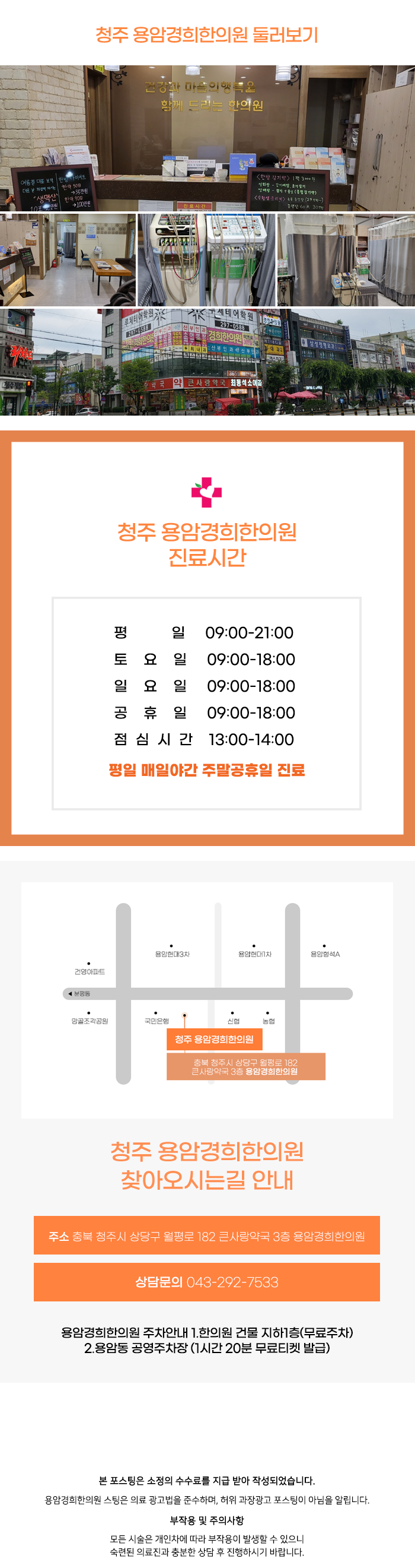 외에도 다양한 한방치료는 환자분 교통사고 후유증과 건강상태, 체질 등에 따라 다르게 적용되므로 검진 후 용암경희한의원 담당 의료진과 상담을 통해 치료계획을 확인할 수 있습니다.
