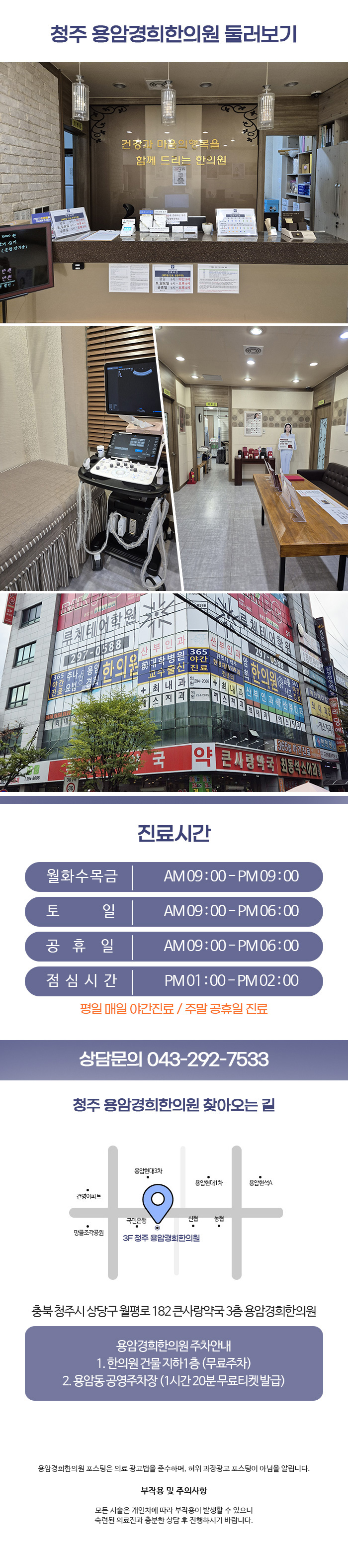 평일 밤 9시까지 야간진료를 하며 주말과 공휴일에도 6시까지 진료를 하고 있으므로 참고하셔서 편한 시간에 방문해주시면 됩니다. 한방치료와 함께 면역력 증진을 위한 개인적인 관리가 동반된다면 보다 원활하고 빠른 회복을 기대할 수 있습니다.