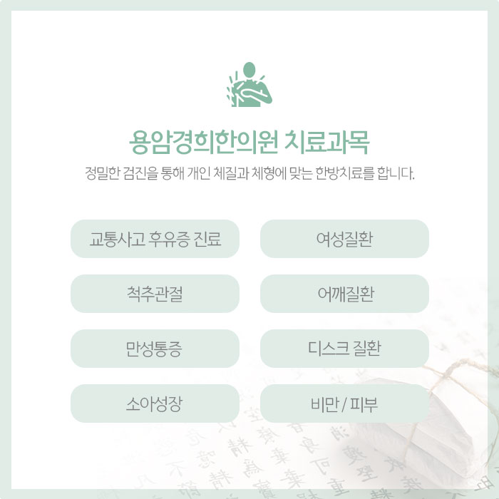 방서동한의원에서는 통합적인 한방치료로 안면마비 회복과 후유증 예방 및 면역력 증진을 도와드립니다. 그리고 신체 곳곳의 통증, 교통사고후유증, 소아성장, 한방다이어트, 여성질환 등 진료하며 많은 분들의 건강회복을 도와드립니다. 과잉진료 없이 환자분에게 꼭 필요한 치료만 하며 검증된 재료와 방법으로 정직한 진료를 약속드립니다.