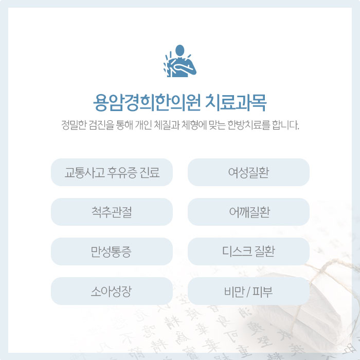 용암경희한의원에서는 정밀한 검진을 바탕으로 환자분 체질에 맞는 한방치료를 하며 과잉진료 없이 검증된 재료와 방법으로 정직한 진료를 약속드립니다.