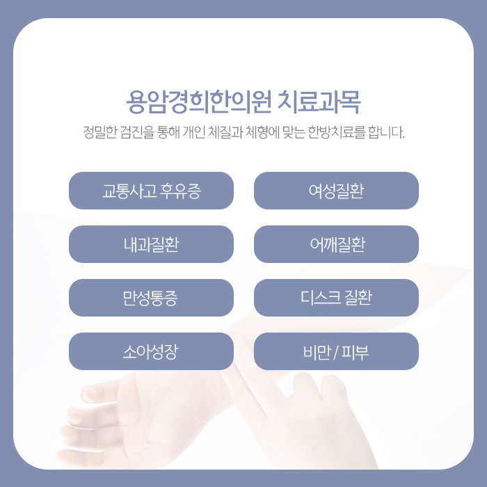 생리불순과 동반되는 여러 문제 개선을 위해 용암동토요일한의원에서는 추나요법, 한약, 약침, 부항, 뜸 등의 통합적인 한방치료를 진행합니다. 체질에 맞는 약재를 구성해 조제되는 한약은 자궁과 골반, 하복부 주변 어혈을 제거하고 기혈순환을 촉진해 자궁과 난소 기능을 강화하고 정상적인 배란을 돕습니다.